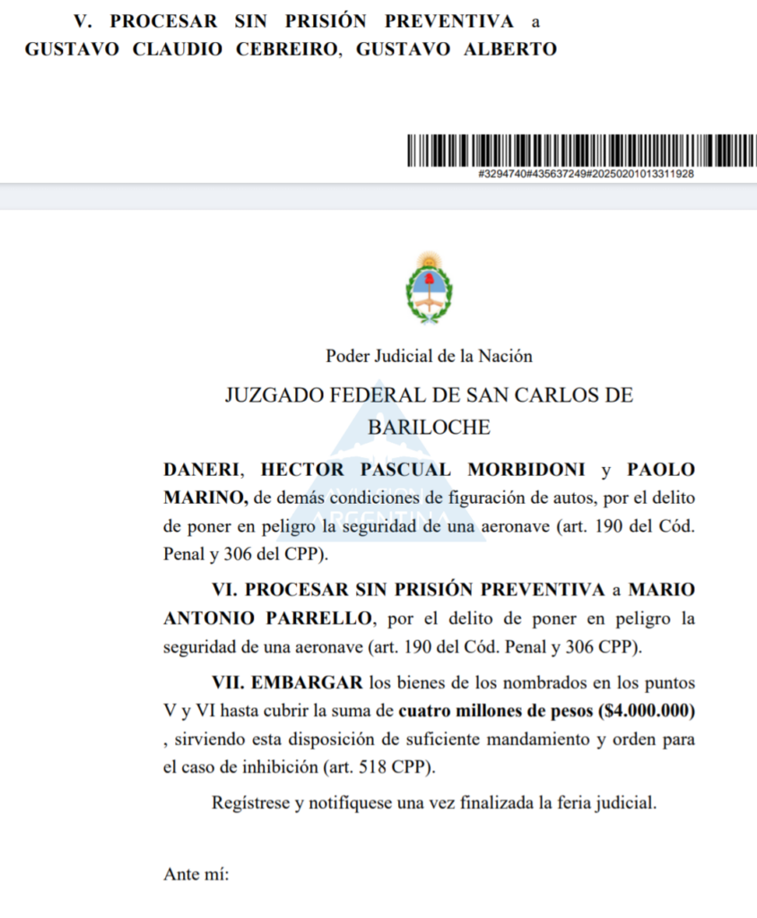 A Paolo Marino en caso de encontrarlo culpable de lo que se lo acusa seria sentenciado a cumplir una pena que va de 10 a 25 años de prisión- mientras que junto al procesamiento se decretó su prisión preventiva aunque se considera por el momento no hacerla efectiva y se le aplico un embargo de cuatro millones de pesos ($4.000.000) por el delito de poner en peligro la seguridad de una aeronave.
