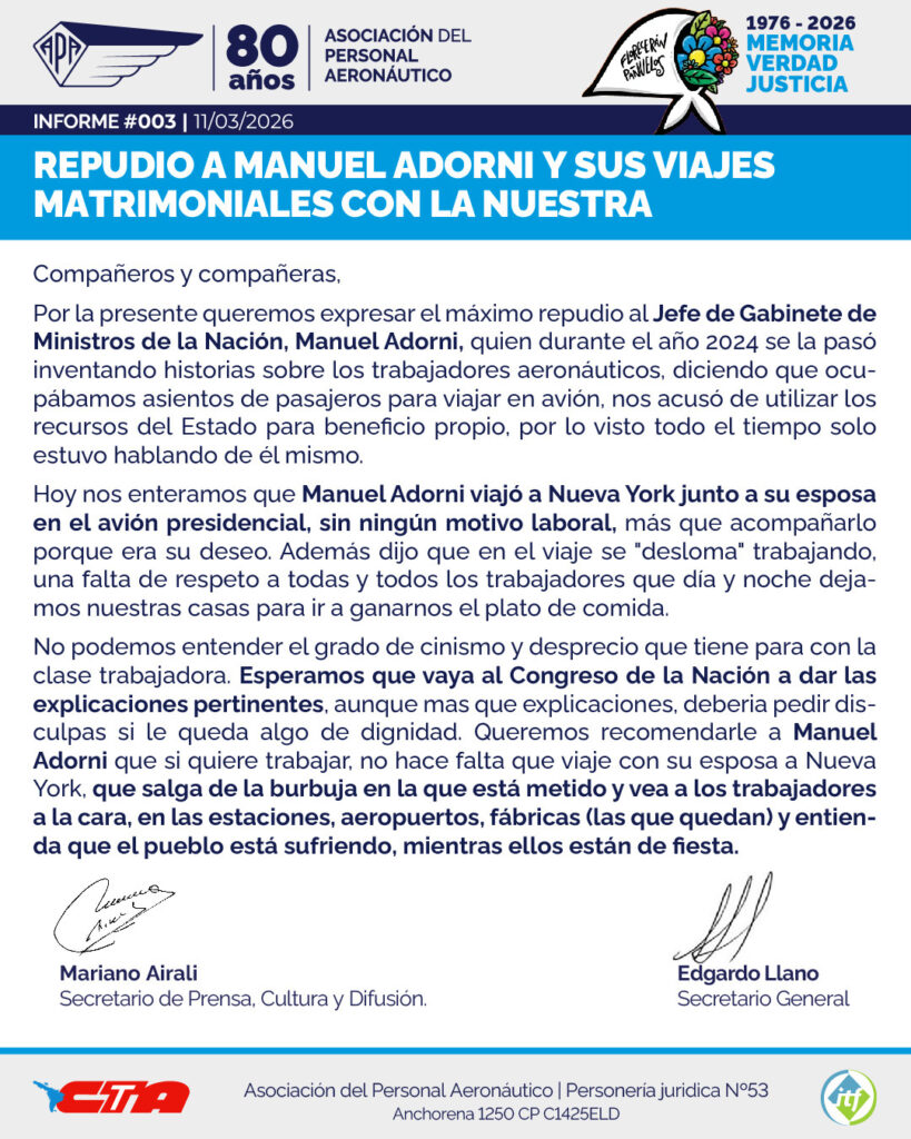 Sobre el vuelo realizado a EEUU por el jefe de Gabinete Manuel Adorni, el Sindicato liderado por Edgardo Llano, Asociación Personal Aeronáutico -APA- fijo posición al respecto en mediante un comunicado oficial titulado “REPUDIO A MANUEL ADORNI Y SUS VIAJES MATRIMONIALES CON LA NUESTRA. Lo compartimos