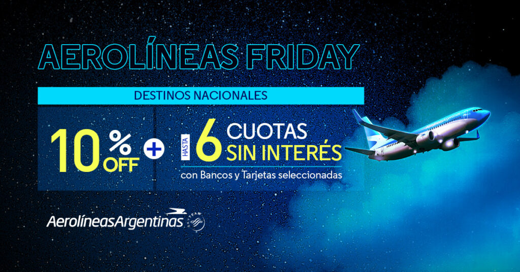 Aerolíneas Argentinas presenta “Aerolíneas Friday”, una propuesta comercial con beneficios exclusivos para viajar dentro del país. La promoción estará vigente entre el jueves y el domingo inclusive e incluye 10% de descuento en destinos nacionales y la posibilidad de financiar las compras en hasta 6 cuotas sin interés con todos los bancos.