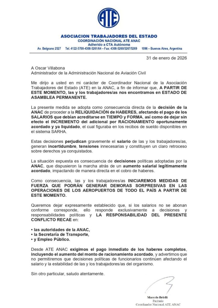 Estos rumores se transformaron en una realidad cuando desde ATE-ANAC lo confirmaron en una carta dirigida al Administrador Nacional, Oscar Villabona y firmada por Marcelo Belelli Coordinador Nacional de ATE-ANAC.