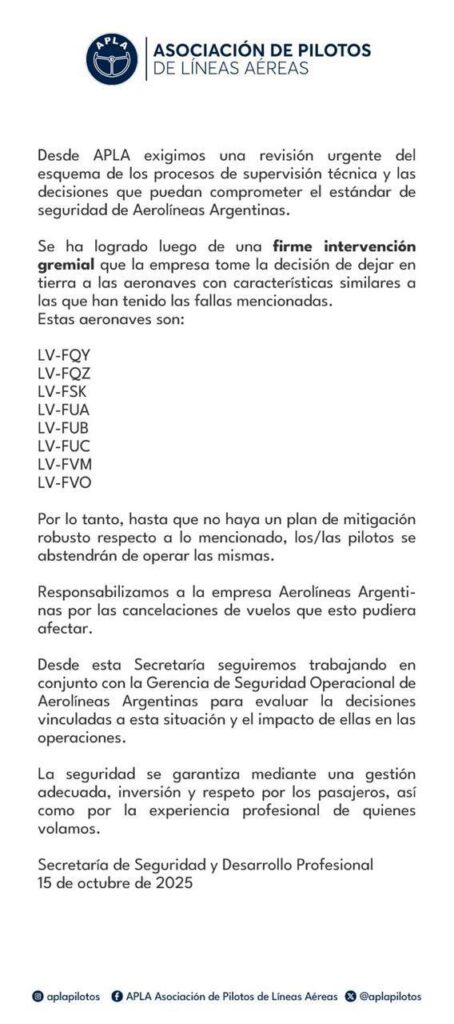 El comunicado de APLApilotos finaliza con la siguiente afirmación “responsabilizamos a la empresa Aerolíneas Argentinas por las cancelaciones de vuelos que esto pudiera afectar. Hasta que no haya un plan de mitigación robusto respecto a lo mencionado, los/las pilotos se abstendrán de operar las mismas.”