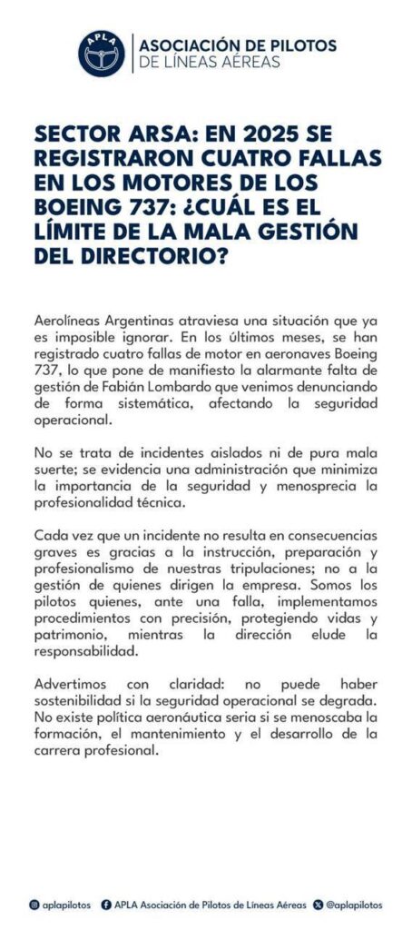 “Somos los pilotos quienes ante una falla implementamos procedimientos con precisión protegiendo vidas y patrimonio mientras la dirección de la empresa elude la responsabilidad” expresan desde APLA y exigen se realice “una revisión urgente del esquema de los procesos de supervisión técnica y las decisiones que puedan comprometer el estándar de seguridad de Aerolíneas Argentinas”