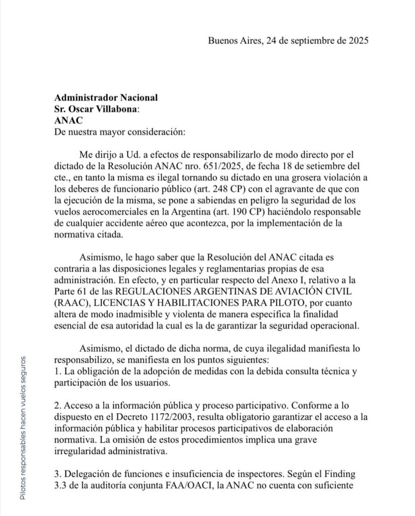 La respuesta a lo firmado por Oscar Villabona el 18 de setiembre llego de manera, clara, precisa y contundente desde APLApilotos mediante una carta firmada por Pablo Biro, en donde el Administrador Nacional es intimado para que convoque una reunión participativa y para que derogue la RESO 651/2025. Caso contrario el sindicato iniciara acciones legales civiles y/o penales en su contra por violar o incumplir los artículos 248 y 190 del código penal.