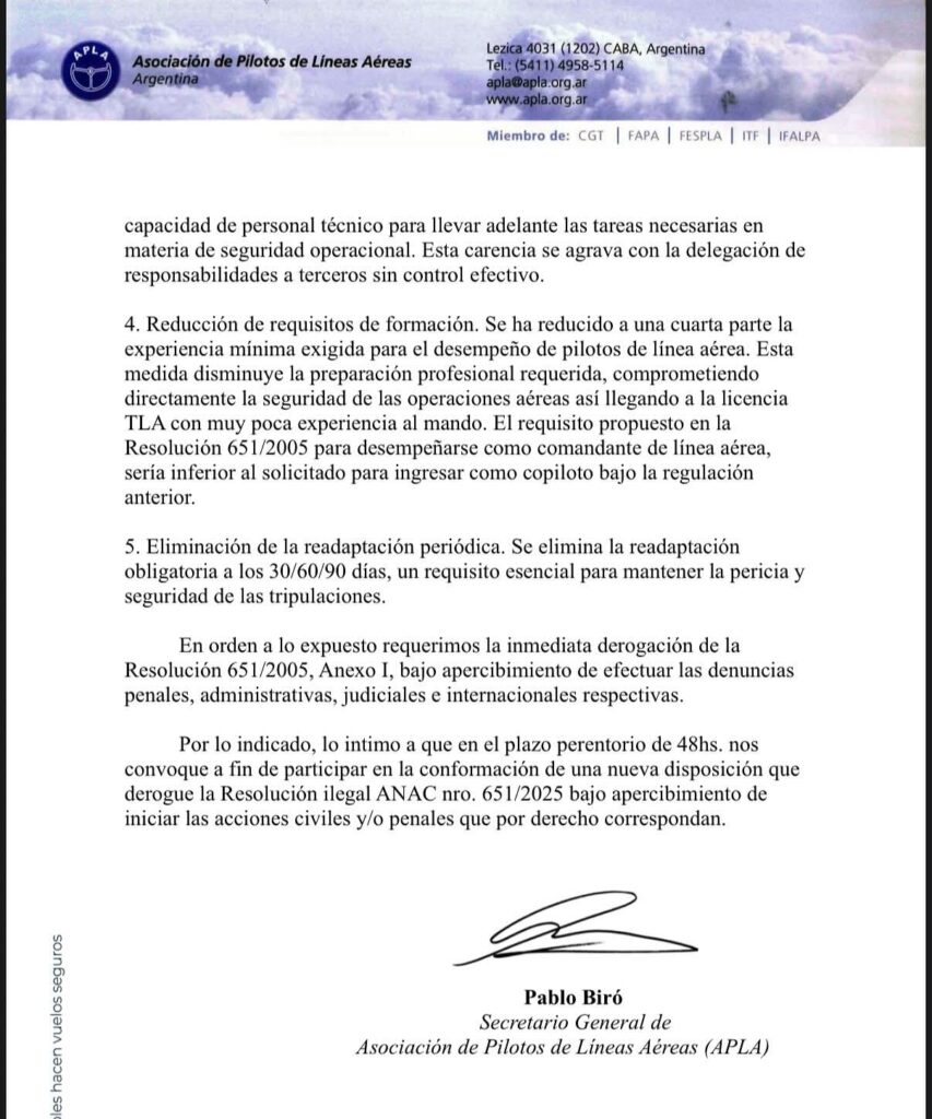 Además el sindicato conducido por Biro, hace saber que esta resolución de ANAC es contraria a las disposiciones legales y reglamentarias propias de la administración respecto al ANEXO 1, relativo a la parte 61 de las RAAC –Regulaciones Argentinas de Aviación Civil, Licencias y Habilitaciones para piloto, por cuanto altera de modo inadmisible y violenta de manera específica la finalidad esencial de esa autoridad la cual es la de garantizar la seguridad operacional.