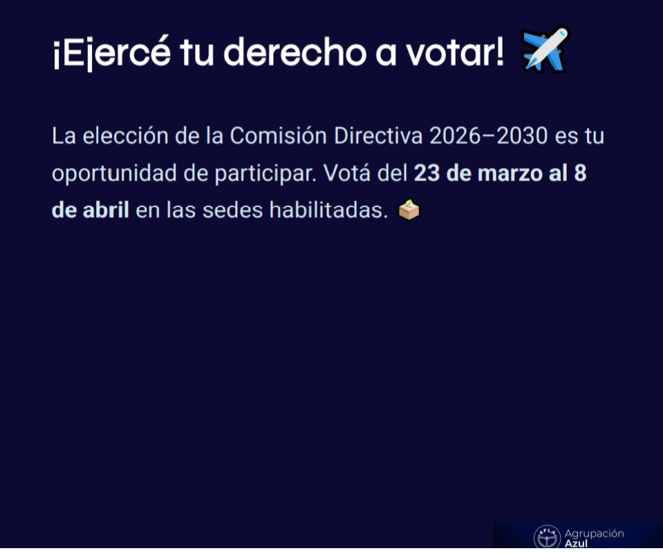 Sin lista opositora, la lista azul con Pablo Biró como Secretario General, es la opción que tienen los pilotos nucleados en APLA -Asociación Pilotos de Líneas Aéreas- para ejercer su derecho democrático eligiendo autoridades y una renovada comisión directiva para el periodo 2026-2030.