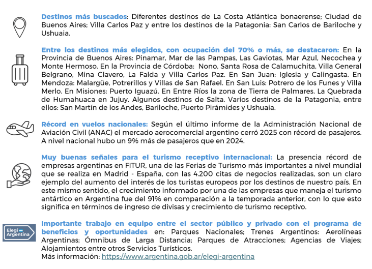 – Por su parte, Entre Ríos también tuvo un fuerte movimiento turístico en el inicio del año con más de 2 millones de visitantes y una ocupación provincial promedio del 66% con la zona de Tierra de Palmares (Colón, Villa Elisa, San José) destacándose entre los más elegidos con el 76%.
