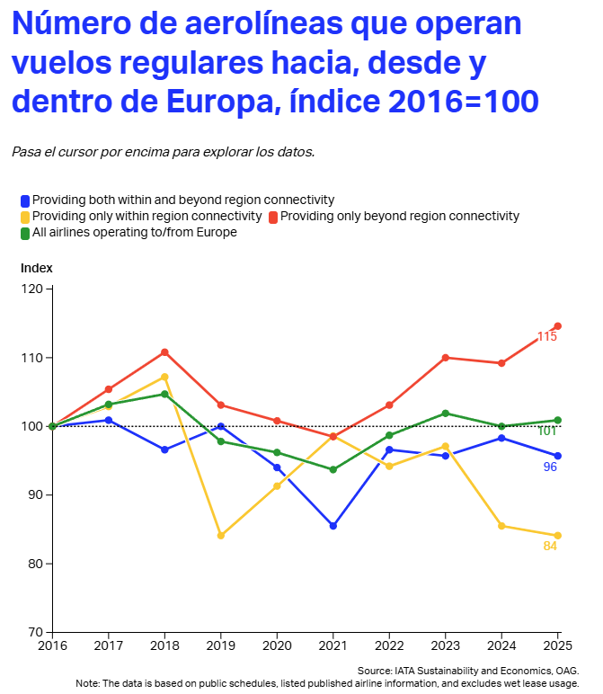 Las opciones de vuelos de larga distancia para los viajeros europeos han proliferado. El número de aerolíneas que operan rutas a otros continentes aumentó a 261 en 2025, frente a las 247 de 2016. Cabe destacar que, en 2025, hasta 149 aerolíneas ofrecían exclusivamente conexiones fuera de Europa, lo que supone un incremento del 15 %.