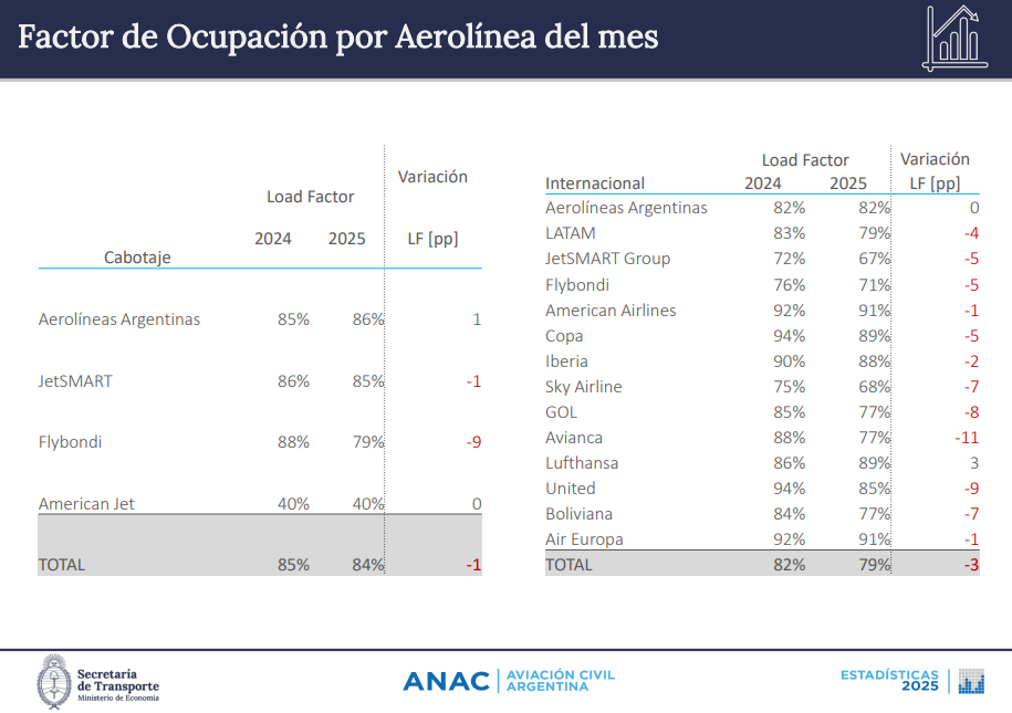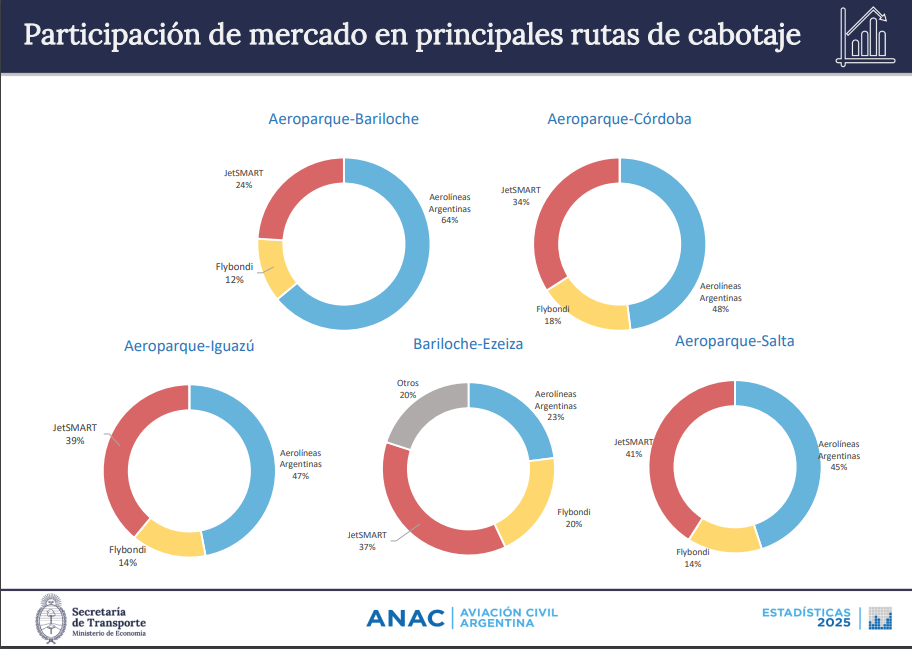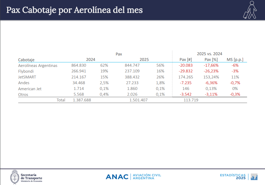 Según las estadísticas oficiales, elaboradas por la Administración Nacional de Aviación Civil -ANAC- el mercado de cabotaje en Argentina durante octubre del 2025 creció en cantidad de pasajeros transportados respecto al mismo mes del año pasado. Durante el décimo mes de este año se transportaron 1.432.440 contra 1.281.984 del año pasado para el mismo periodo.