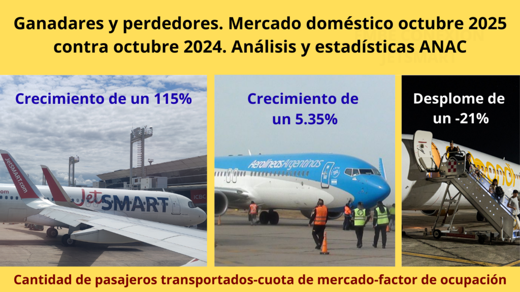En el mercado doméstico, la mejor low cost de Sudamérica en Argentina durante octubre 2025 creció un 115.18S% respecto al mismo mes del año 2024 en cantidad de pasajeros transportados, según las estadísticas de ANAC. Aerolíneas Argentinas también gano pasajeros pero perdió 6% de mercado mientras que Flybondi se desplomo y perdió por todos lados.