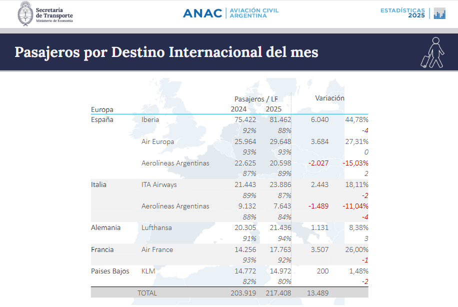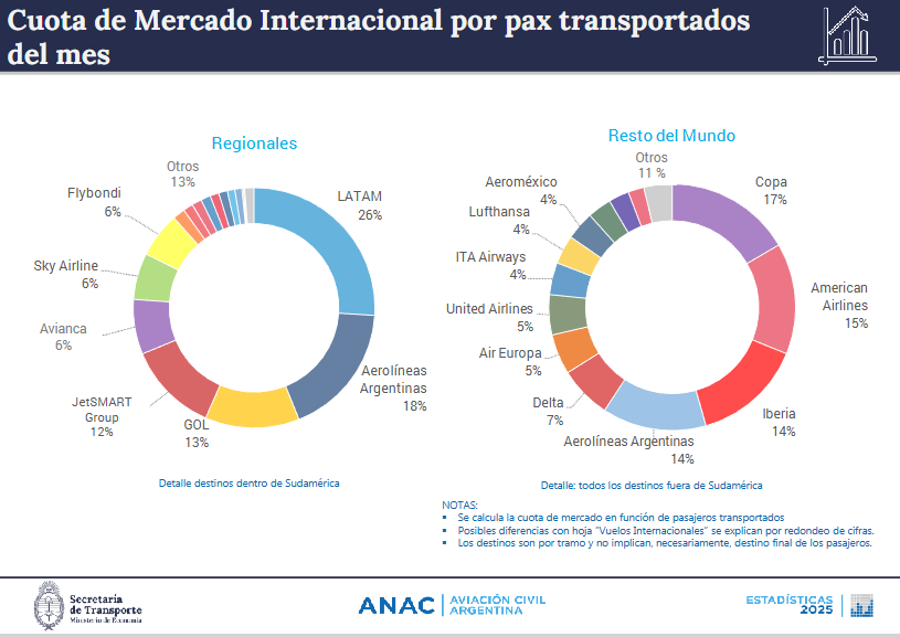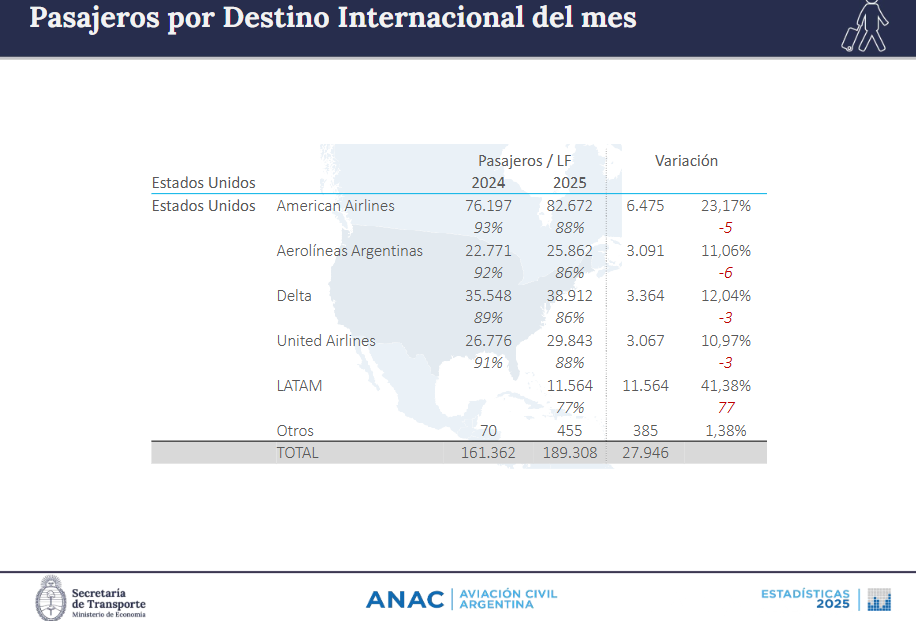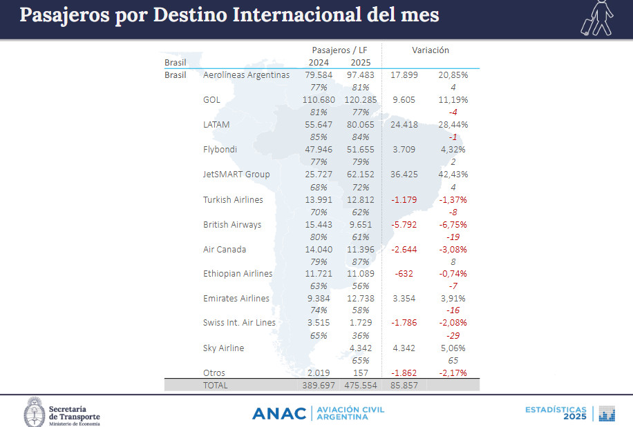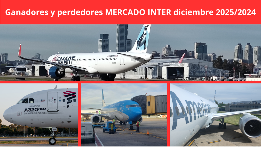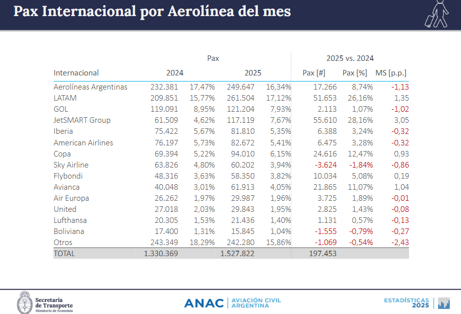 Las estadísticas de ANAC muestran que durante diciembre 2025 contra el mismo mes del 2024 JetSMART creció un 28,16% y gano el primero puesto. Segunda se ubico LATAM con un 26.16% de crecimiento. Aerolíneas Argentinas se ubico quinta con un 8.74% de crecimiento ganando pasajeros a EEUU y Brasil, pero perdiendo en Europa.