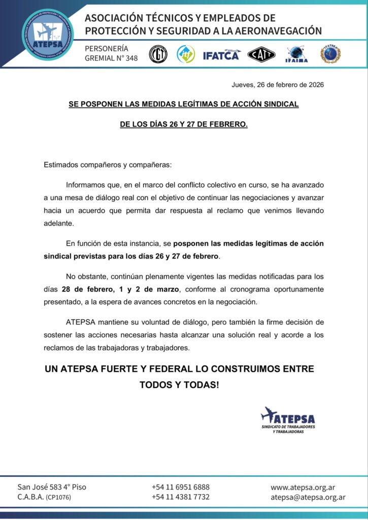 La medida de fuerza anunciada por ATEPSA -Controladores Aéreos- que se iniciaba hoy quedo sin efecto para este jueves y mañana viernes 27. Tras la reunión de esta mañana se abrió una instancia de dialogo. El sindicato aseguro que las medidas de fuerza correspondientes a los días sábado 28, domingo 1 de marzo y lunes 2 continúan vigentes.