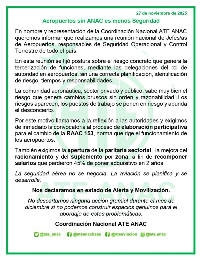 El comunicado oficial de la entidad gremial finaliza sosteniendo que la seguridad aérea no se negocia dado que la aviación se planifica y se desarrolla. ATE-ANAC se declaró en estado de alerta y movilización contemplando la posibilidad de realizar medidas de acción sindical durante el mes de diciembre si no se construye un espacio genuino para el abordaje de las problemáticas planteadas.