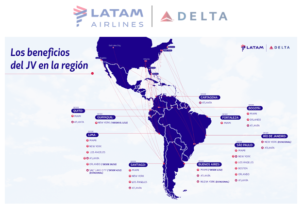 Con Atlanta (ATL), Boston (BOS), Los Ángeles (LAX), Miami (MIA), Nueva York (JFK) , Orlando (MCO) y Salt Lake-City (SLC) como puertas de entrada en América del Norte, y Bogotá (BOG), Cartagena (CTG), Fortaleza (FOR), Lima (LIM), Quito (UIO), Río de Janeiro (GIG), Santiago (SCL), São Paulo (GRU) y Buenos Aires (EZE) como puertas de entrada en América del Sur, el Joint Venture Delta-LATAM opera 30 rutas directas, conectando ciudades clave en ambos continentes.