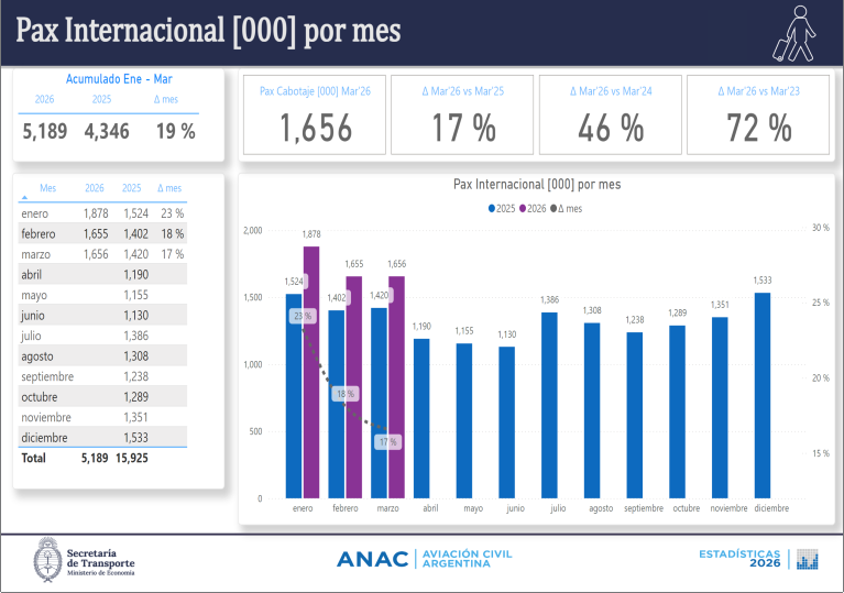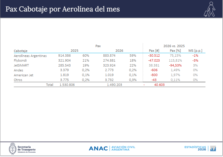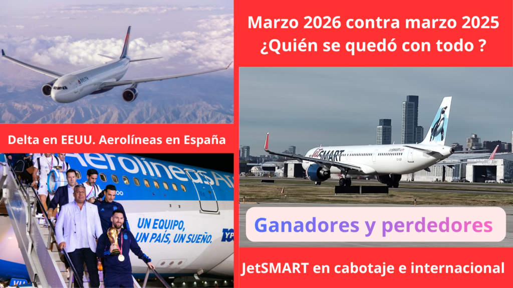 Según las estadísticas -MARZO 2026 contra MARZO 2025- elaboradas y publicadas por ANAC para el interanual JetSMART se quedo con todo, domestico e inter. En el largo radio con Europa Aerolíneas Argentinas fue la que más creció, aunque perdió en el doméstico. Iberia volvió a perder pasajeros por segundo mes consecutivo y con EEUU, Delta pico en punta.