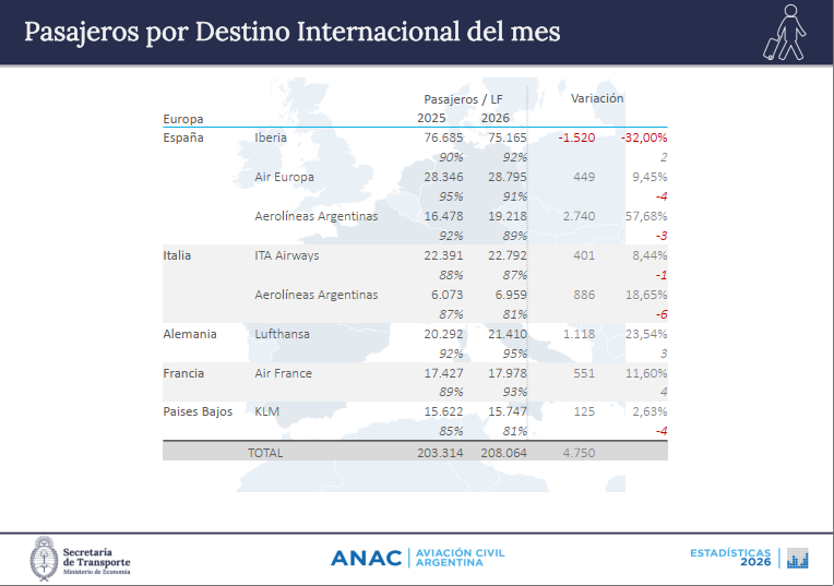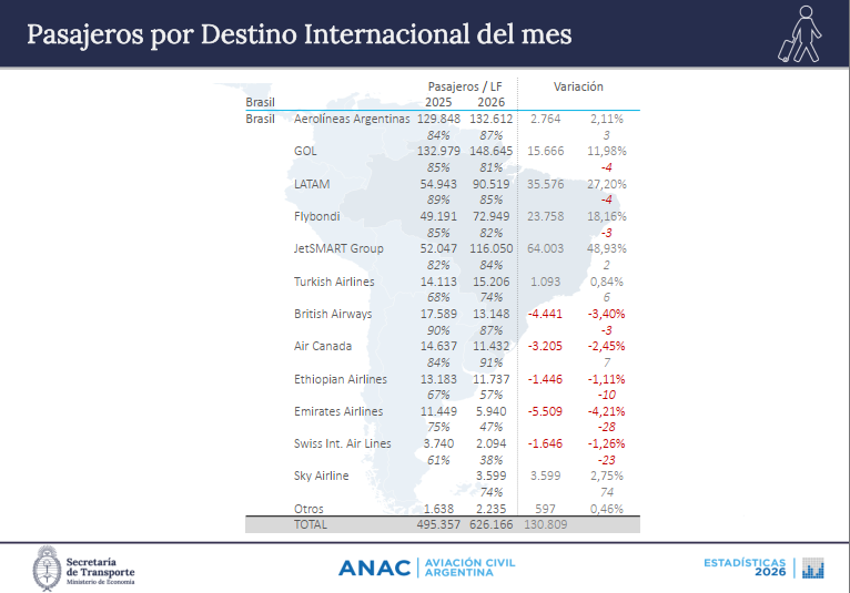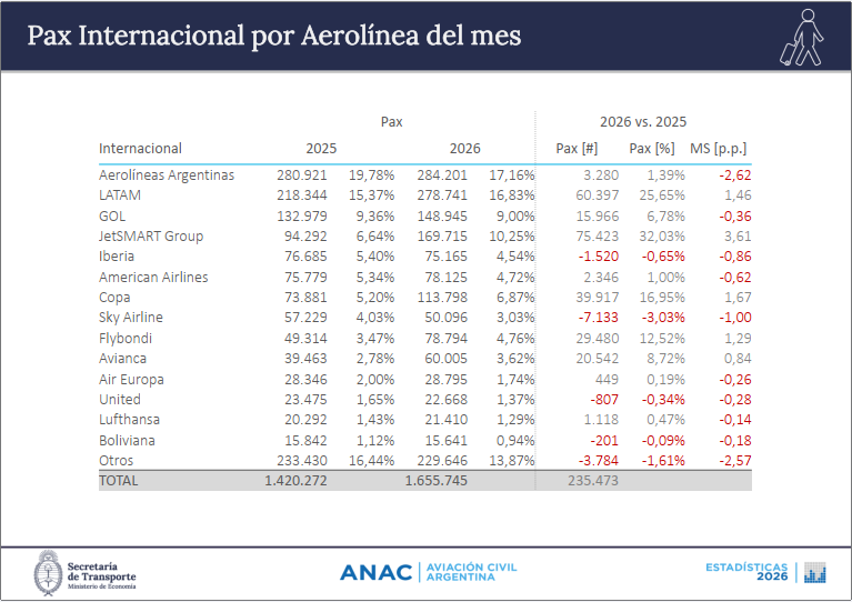 Agarrando la lupa y haciendo foco en el podio de los triunfadores del mercado internacional nuevamente JetSMART obtiene el escalón mas alto quedando primera con 75.423 pasajeros, segunda LATAM con 60.397 viajeros y tercera quedo COPA que sumo 39.917 mas que para el mismo mes del año 2025. Aerolíneas Argentinas apenas gano 3.280 turistas