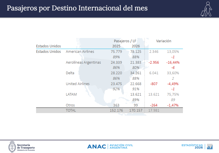 Con EEUU Delta en el interanual fue la que mas gano sumando 6.041 pasajeros, segunda quedo American Airlines con 2.346 viajeros ganados y tercera United que perdió -807 turistas, mientras que Aerolíneas Argentinas perdió -2.956 pasajeros y LATAM que no compara año contra año transporto 13.621 viajeros en su vuelo diario de quinta libertad -Santiago de Chile/Ezeiza/Miami-