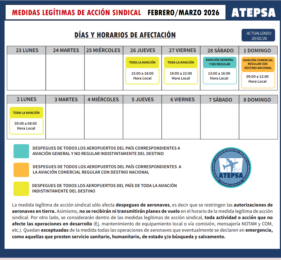 Es importante remarcar que al comenzar cada turno de paro, los arribos son atendidos mientras que no se prestara servicio a los despegues durante toda la franja horaria.