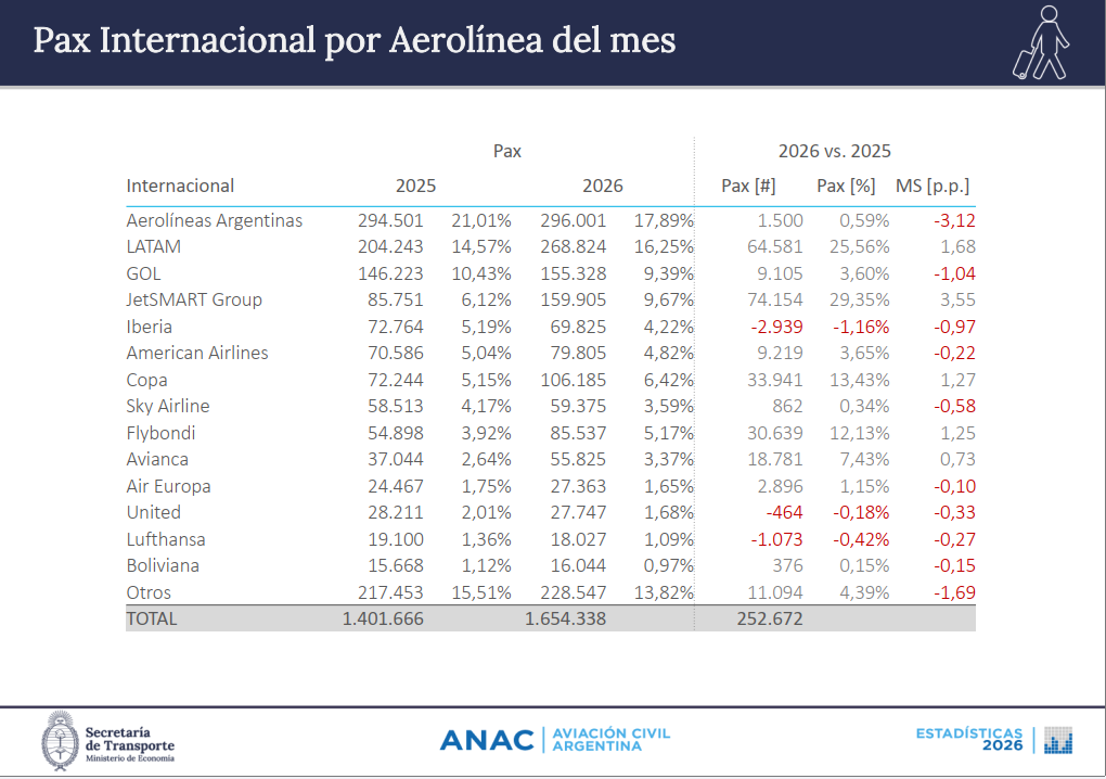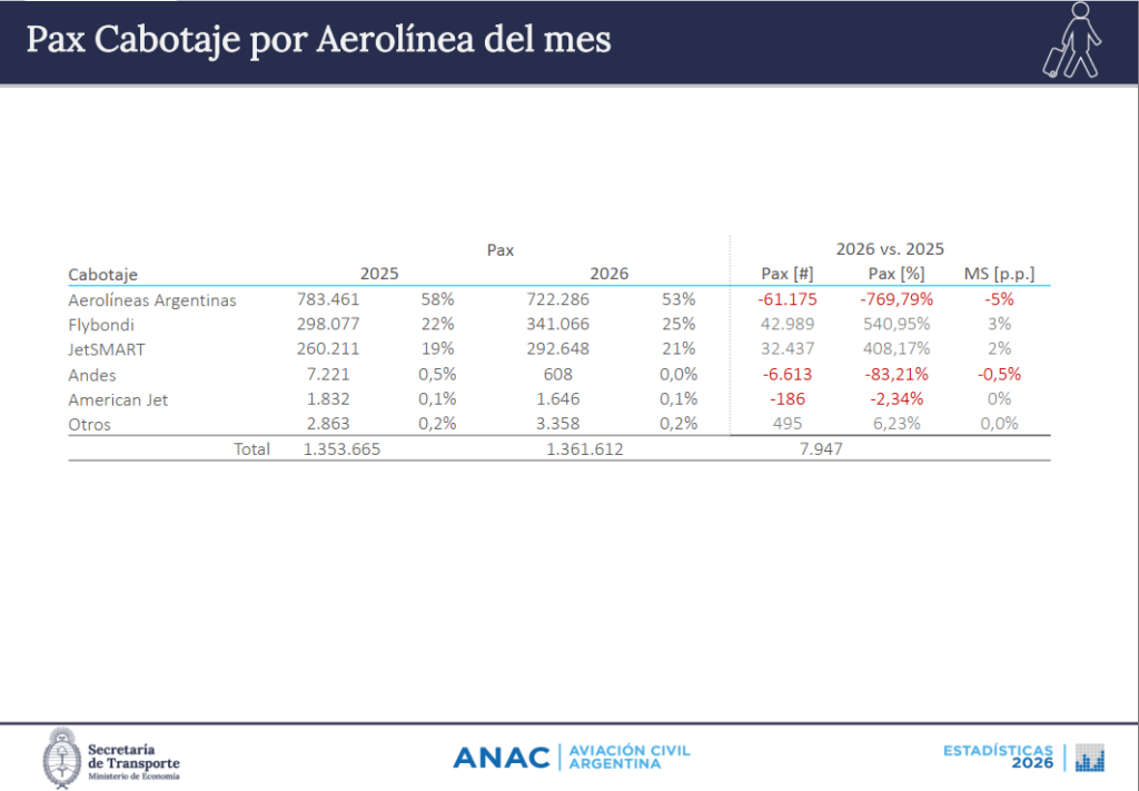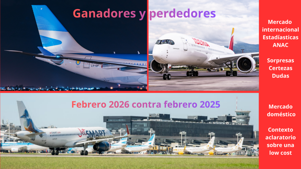 Las estadísticas elaboradas por ANAC -Administración Nacional de Aviación Civil- indican que durante febrero 2026 respecto al mismo mes del 2025 en el mercado domestico Flybondi fue la que más creció -RARO-. JetSMART lidero el crecimiento internacional, Aerolíneas Argentinas perdió pasajeros domésticos. La caída de Iberia sorprende.