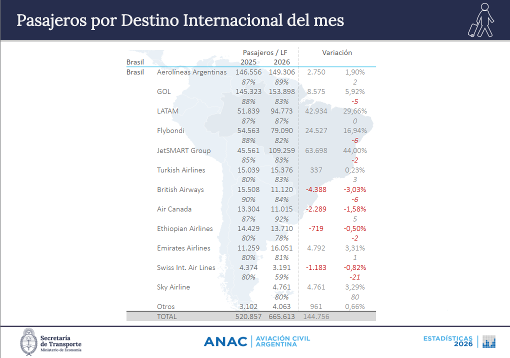 Bajo un acuerdo ilimitado de frecuencias entre ambos países JetSMART alcanzo el primer puesto en crecimiento con 63.698 pasajeros ganados respecto a febrero 2025, segunda se ubico LATAM con 42.934 viajeros adicionales y en tercer lugar quedo Flybondi que con todos sus incumplimientos según ANAC gano 24.527 pasajeros en el periodo analizado. Aerolíneas Argentinas se ubicó quinta.