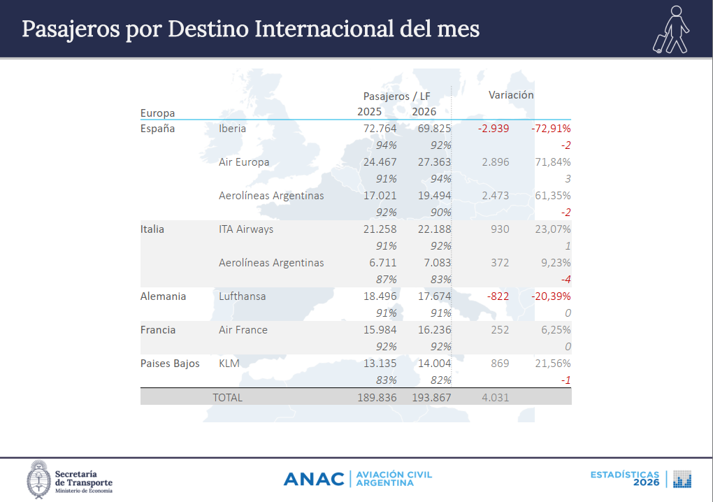 Siendo el mercado con mayor crecimiento lo novedad que sorprende está protagonizada por Iberia que luego de un año de expansión continua en algo más de un año, durante febrero 2026 perdió en la ruta Madrid Buenos Aires casi 3.000 pasajeros respecto al mismo mes del año pasado. Sus competidoras directas en cambio han crecido. Aerolíneas Argentinas gano 2.473 viajeros mientras que Air Europa sumo 2896 pasajeros -tener en cuenta que la aerolínea del Grupo Globalia opera también la ruta, Madrid/Córdoba-.