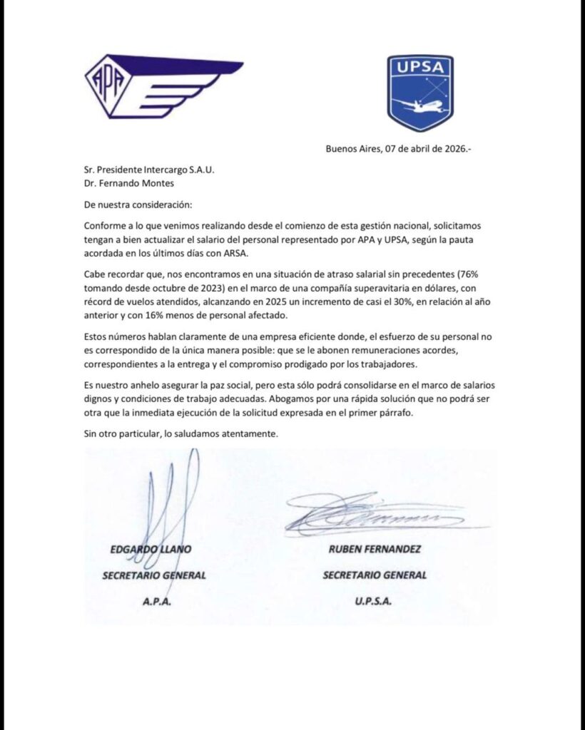 Los dos sindicatos que nuclean al personal de la empresa de handling argentino solicitaron al presidente de Intercargo actualizar los salarios según la pauta acordada días pasados con Aerolíneas Argentinas.