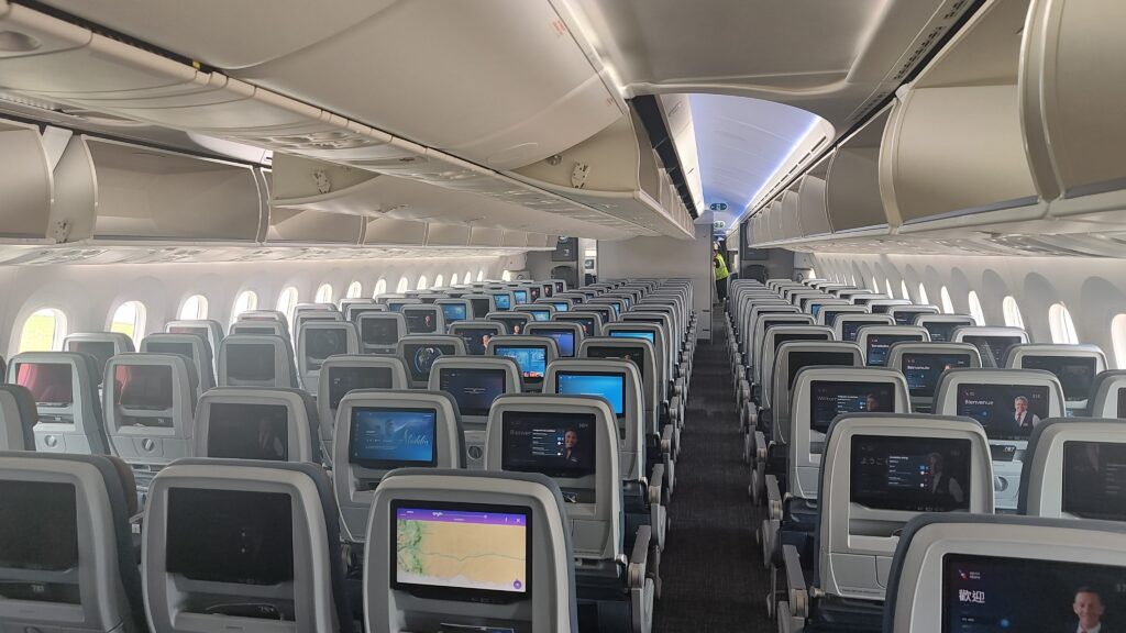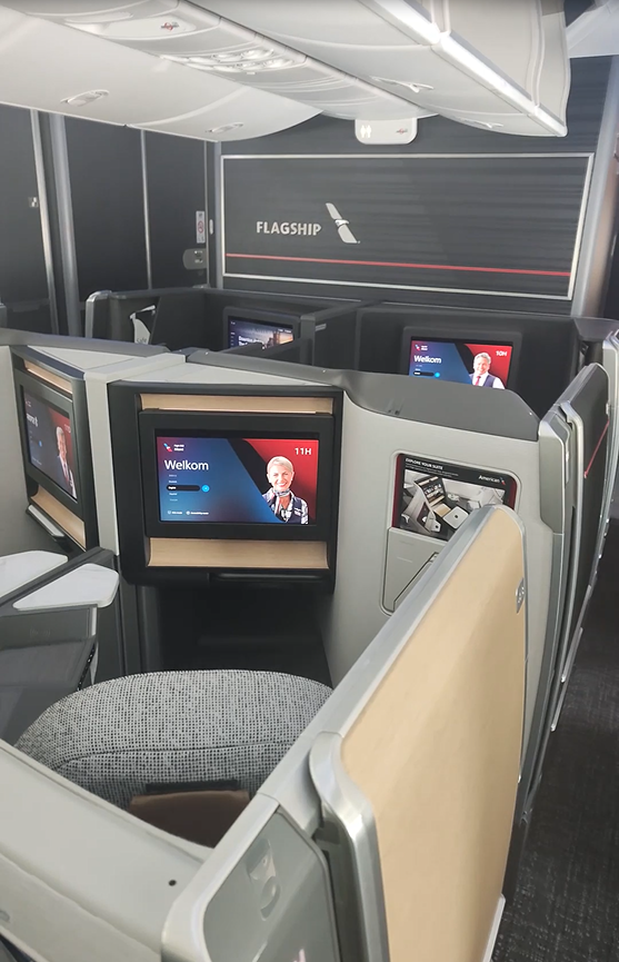 Los clientes que viajen en el Boeing 787-9 con nuevo diseño de American disfrutarán de los 51 asientos Flagship Suite en la parte delantera de la aeronave, que cuentan con puertas de privacidad, más espacio de almacenamiento personal con una almohadilla de carga inalámbrica y una opción de asiento tipo chaise lounge única con un apoyacabezas ajustable. La aeronave tiene una capacidad para 244 clientes, incluyendo 161 asientos en Main Cabin, equipados con puertos USB-C y tomas de corriente alterna (AC) y pantallas QLED 4K, y 32 en Premium Economy, que presentan nuevas alas en el reposacabezas que brindan a los clientes privacidad adicional y nuevos apoya pies para una mayor comodidad.